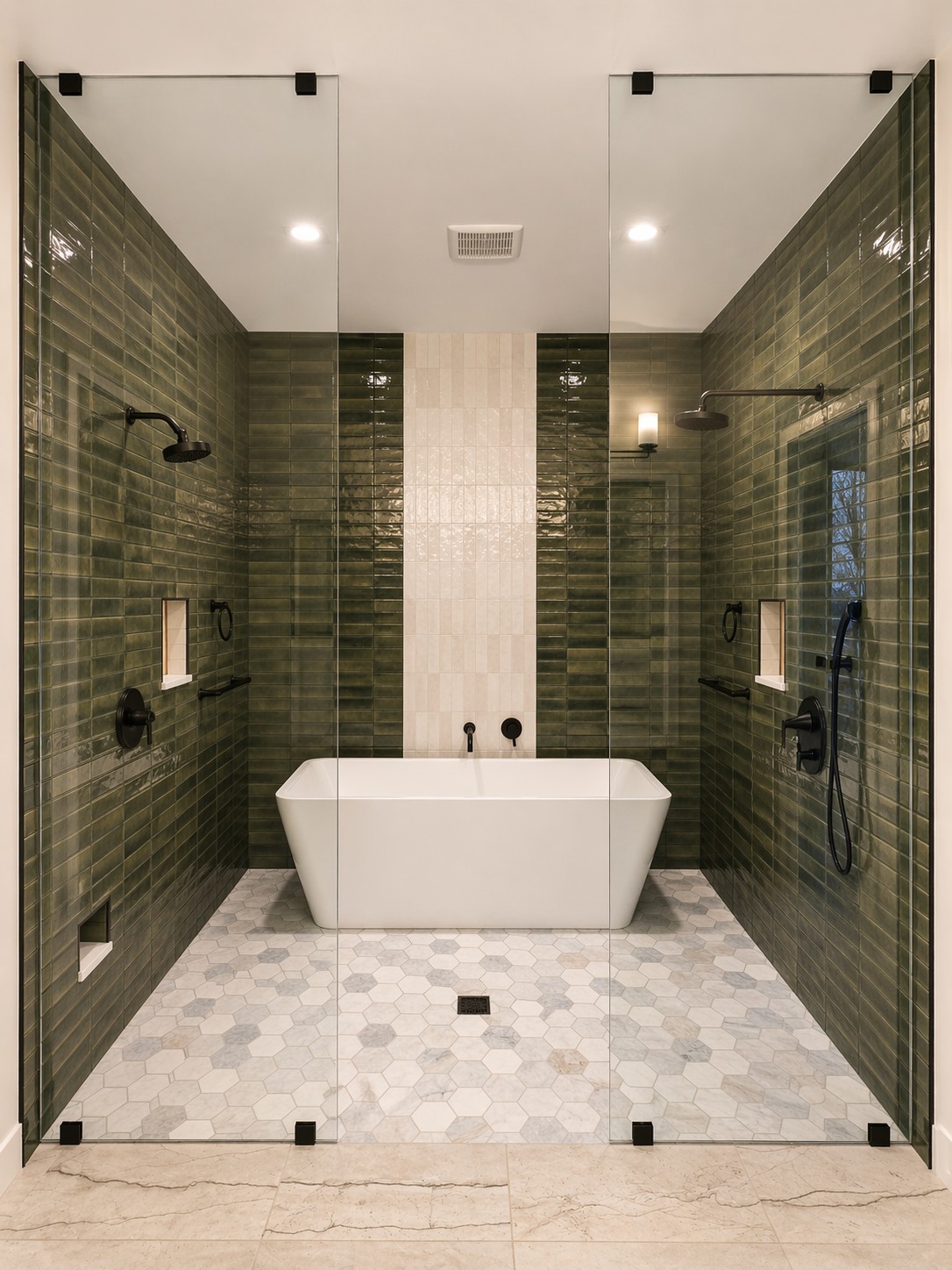 How do you build a 21st century home in a neighborhood of mid century modern homes? Stick to first principles. While many in the cozy suburb of Elmhurst, west of Chicago opt to tear down and replace their mid century homes with faux historical McMansions these owners opted to for a stripped down modernism that borrows from the simple lean to and shed roofs of their 1950’s ranch and salt box neighbors. The contrasting prefinished aluminum panels against the rich wood texture creates a visual and textural dynamism with contemporary materials. The simple geometry translates to the interior where the house explodes into a voluminous family room and kitchen overlooked by a second floor lofted walkway, bathed in south and west facing light. The space is punctuated by a two story fireplace wall and multiple hanging contemporary light fixtures.